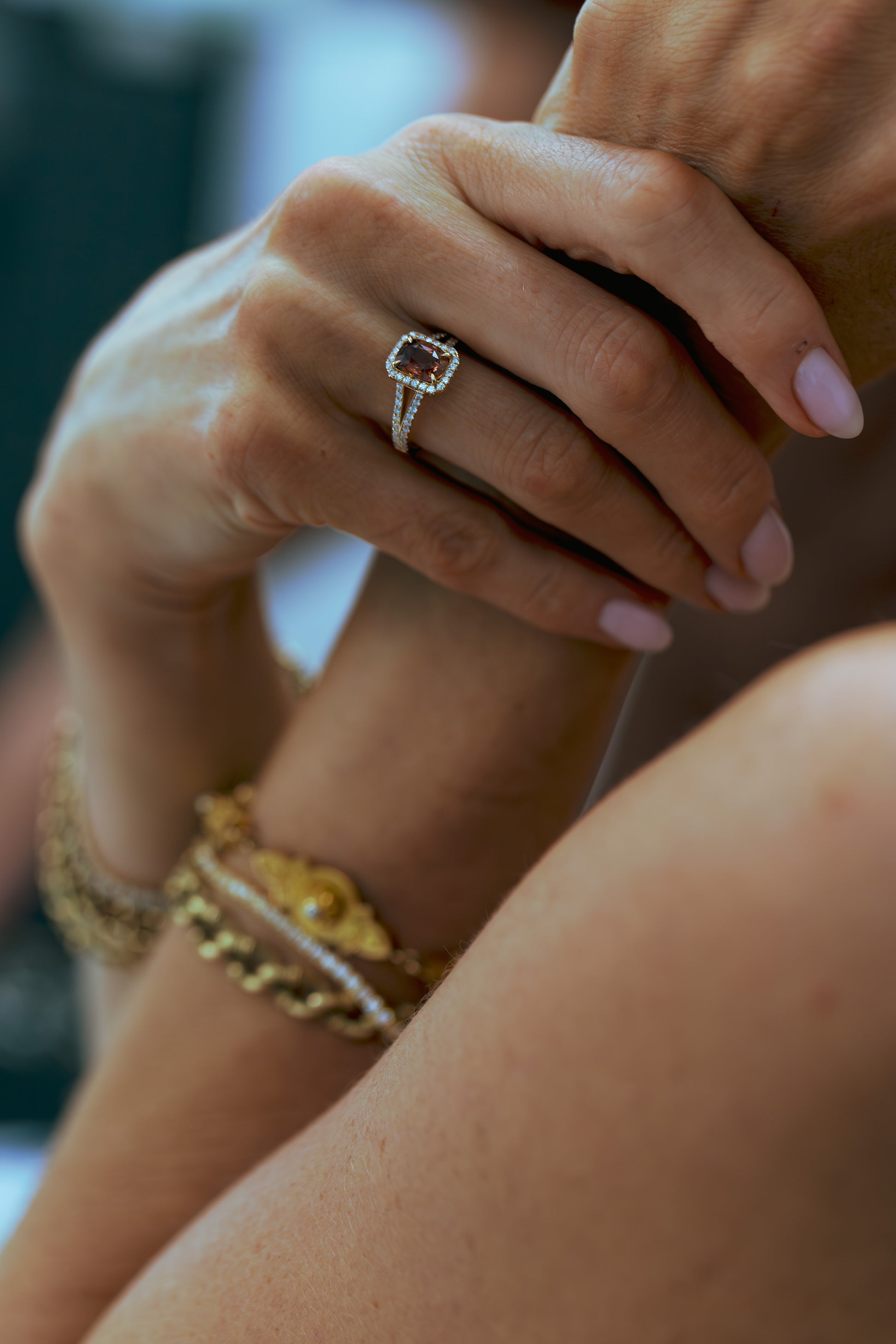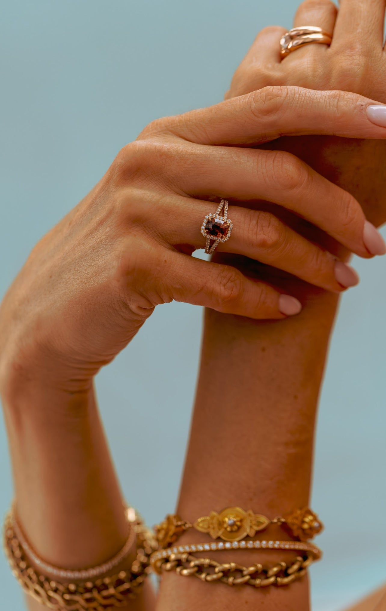 This stone has a certificate from the Ceylon Gem Lab in Sri Lanka. Our master designers and setters created a very special split shank and halo band to enhance the beauty of the center stone. On the shoulders are 40 Round Brilliant Diamonds graded F/G in Color and VS2 to SI1 in Clarity.