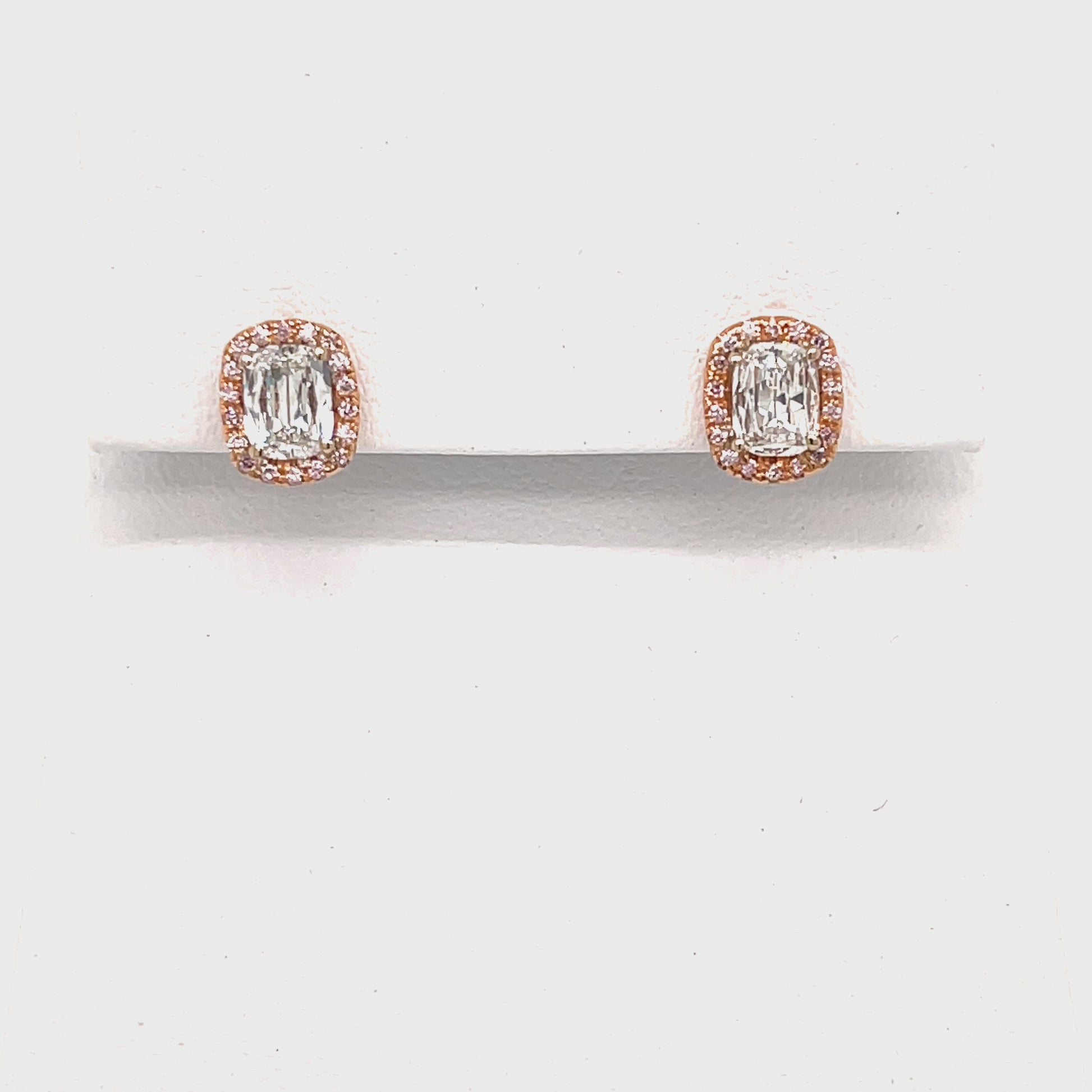 18 Karat Pink Gold Halo Earrings .93 Carats Cushion Brilliant Diamonds .14 Carats Pink Round Diamonds