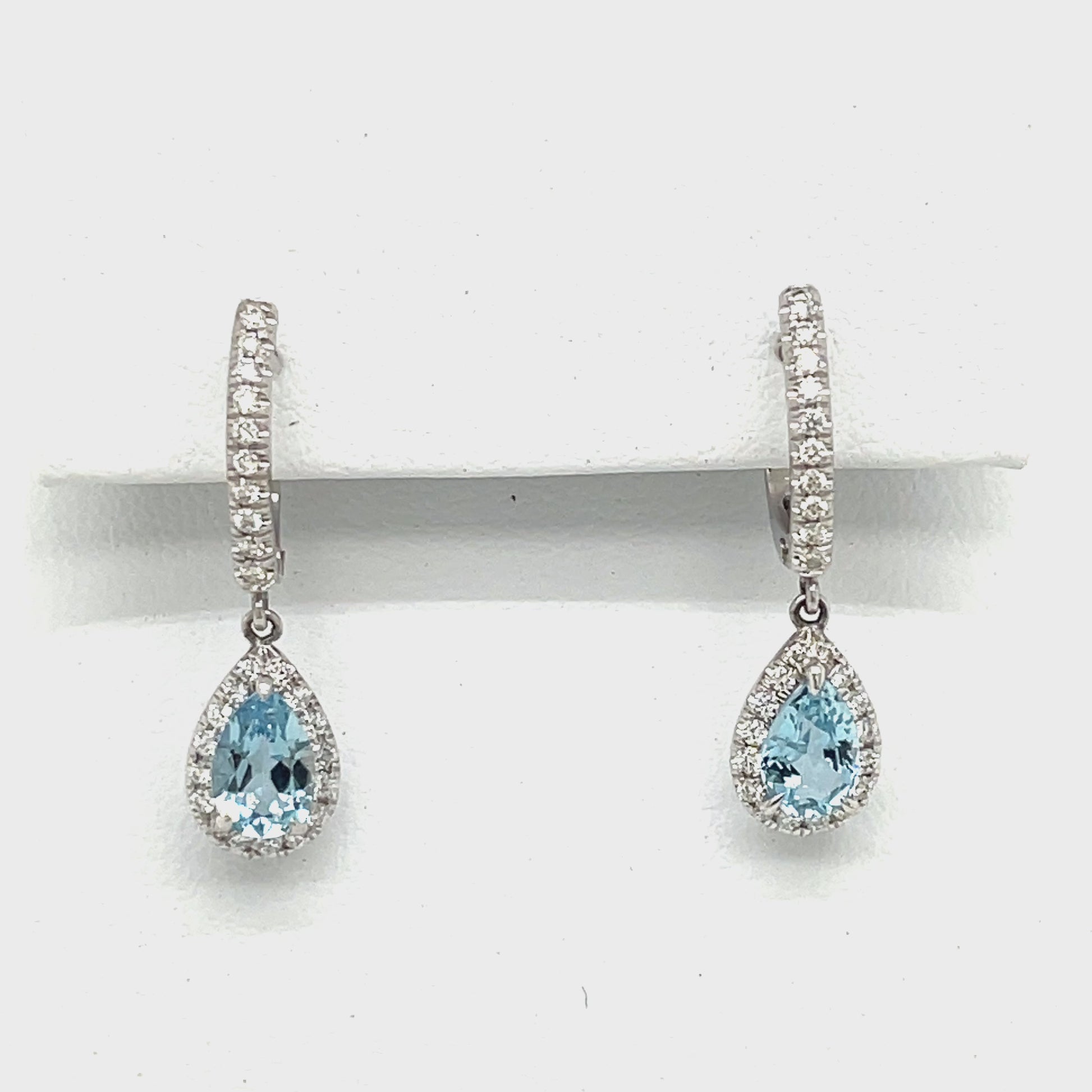These 18 karat white gold earrings have 2 matching 7 x 5 Natural Aquamarine Pear Shape stones. On the clip and in the halo are 52 round diamonds weighing .55 carats total weight and graded G/H in color and VS2 in clarity. The length is almost 1 inch. We make these in NYC with our master setters and jewelers and you can't top the quality of this stunning pair of earrings.