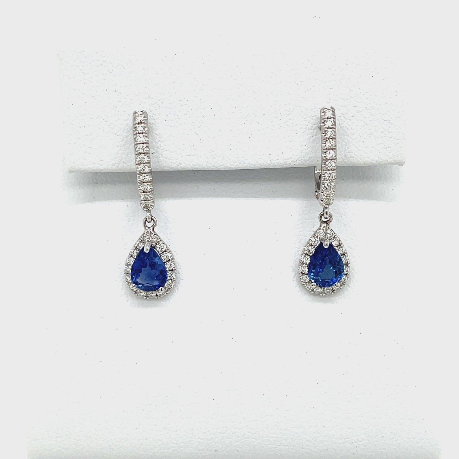 These 18 karat white gold earrings have 2 matching 7 x 5 Natural Blue Pear Shape Ceylon Sapphires weighing 1.70 carats total weight. On the clip and in the halo are 52 round diamonds weighing .55 carats total weight and graded G/H in color and VS2 in clarity. The length is almost 1 inch. We make these in NYC with our master setters and jewelers and you can't top the quality of this stunning pair of earrings.