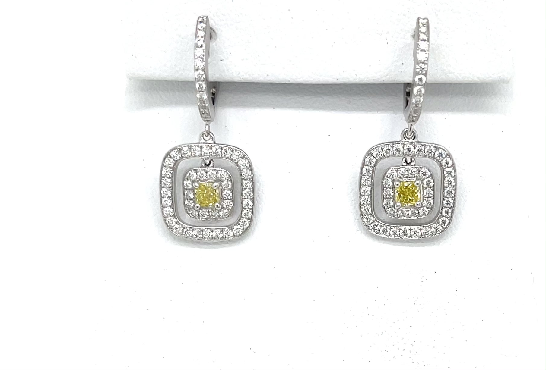 Beautiful 18k white gold double halo pave earrings that feature rare natural fancy yellow princess-cut center diamonds. Yellow diamonds weigh a total of .37 carats and are accented by .72 carats of fine white round diamonds.