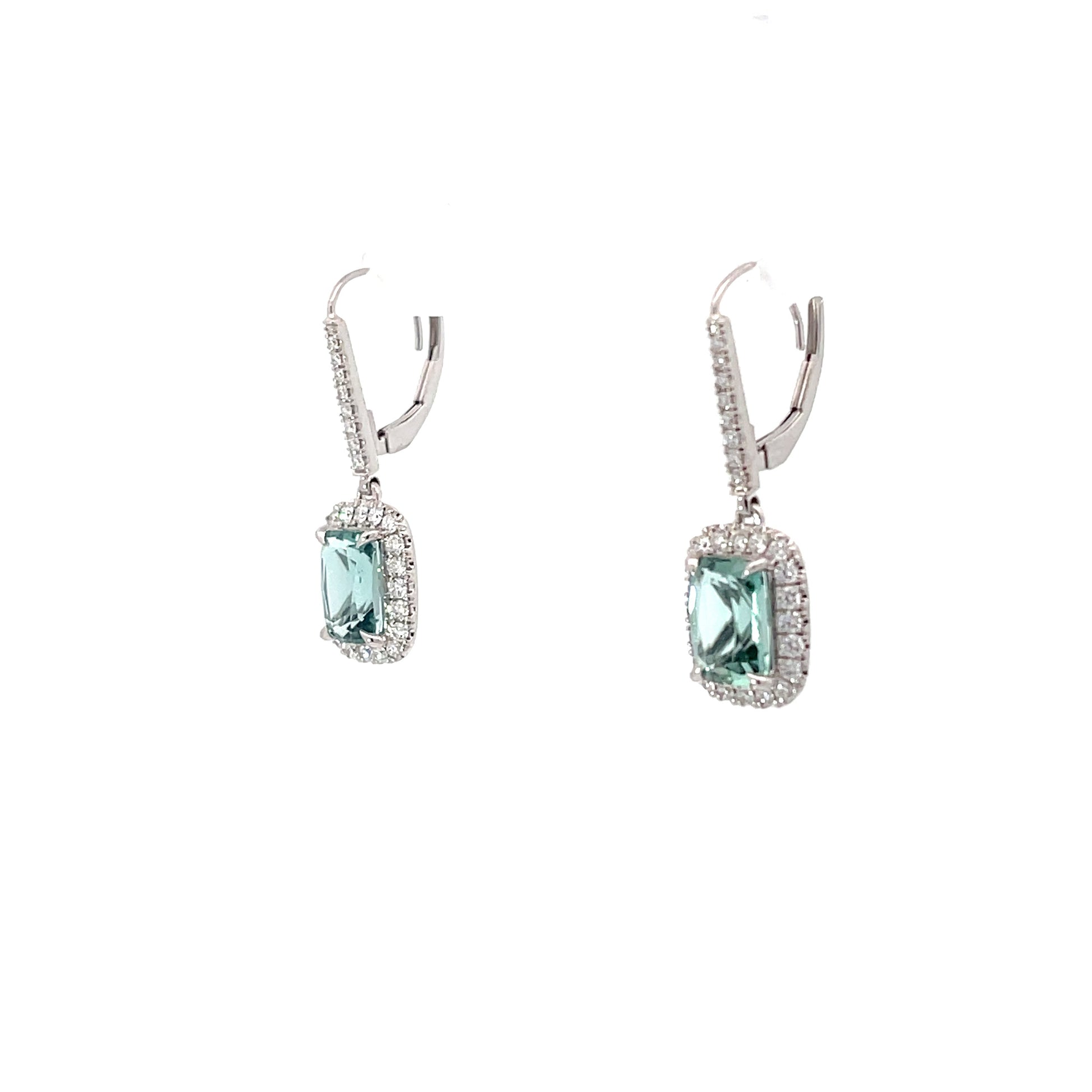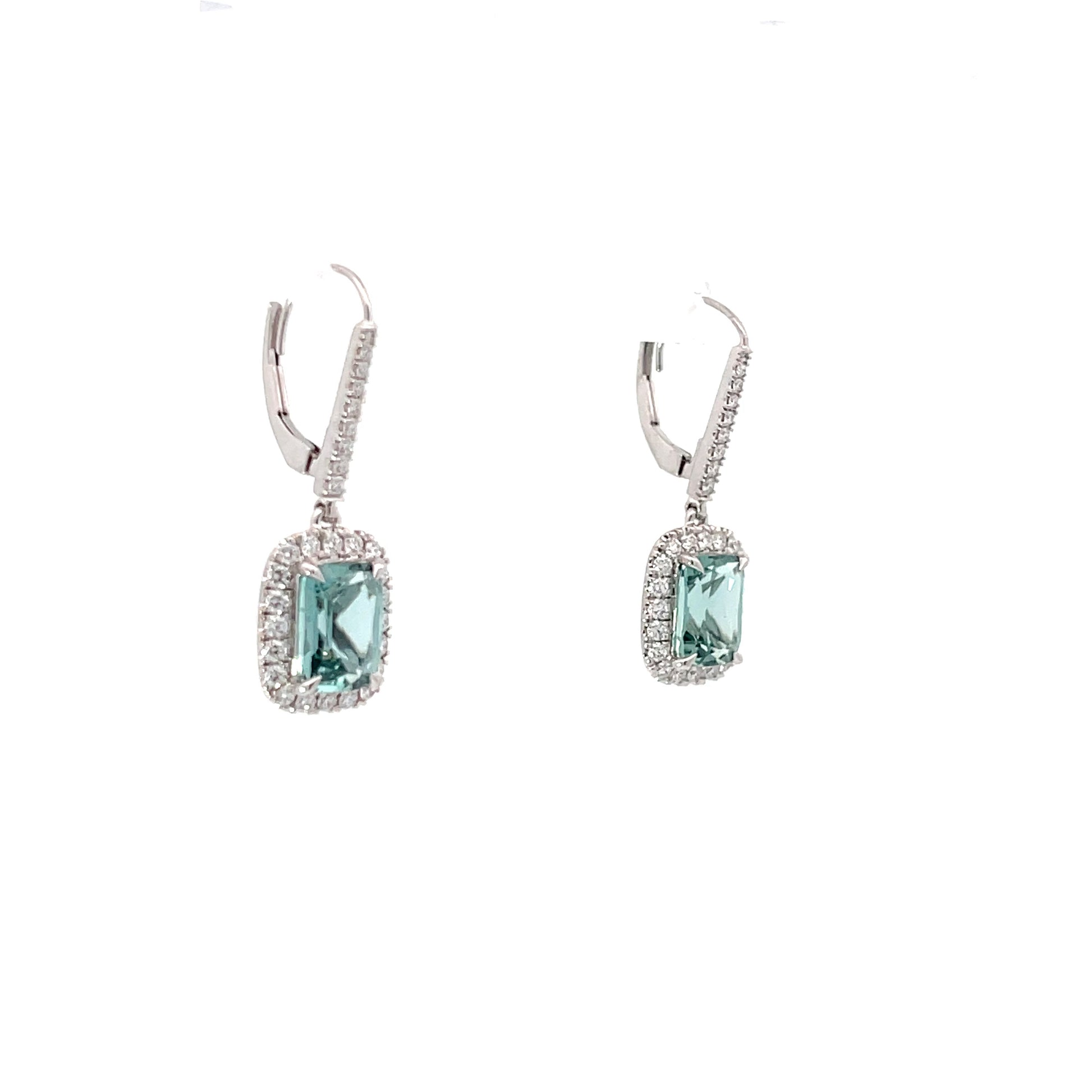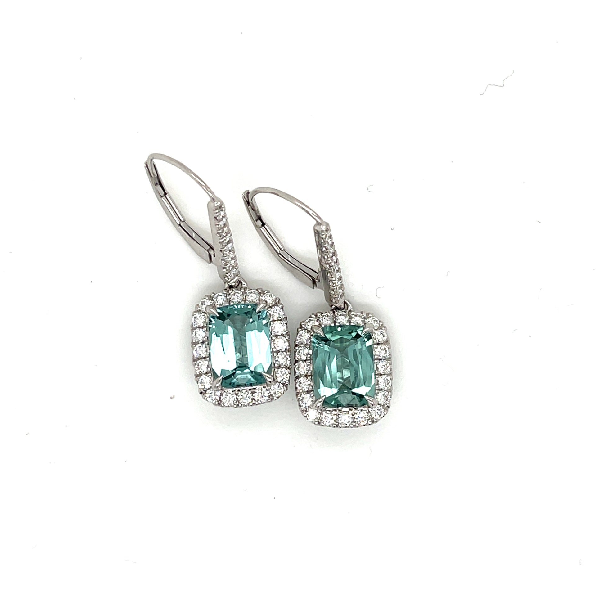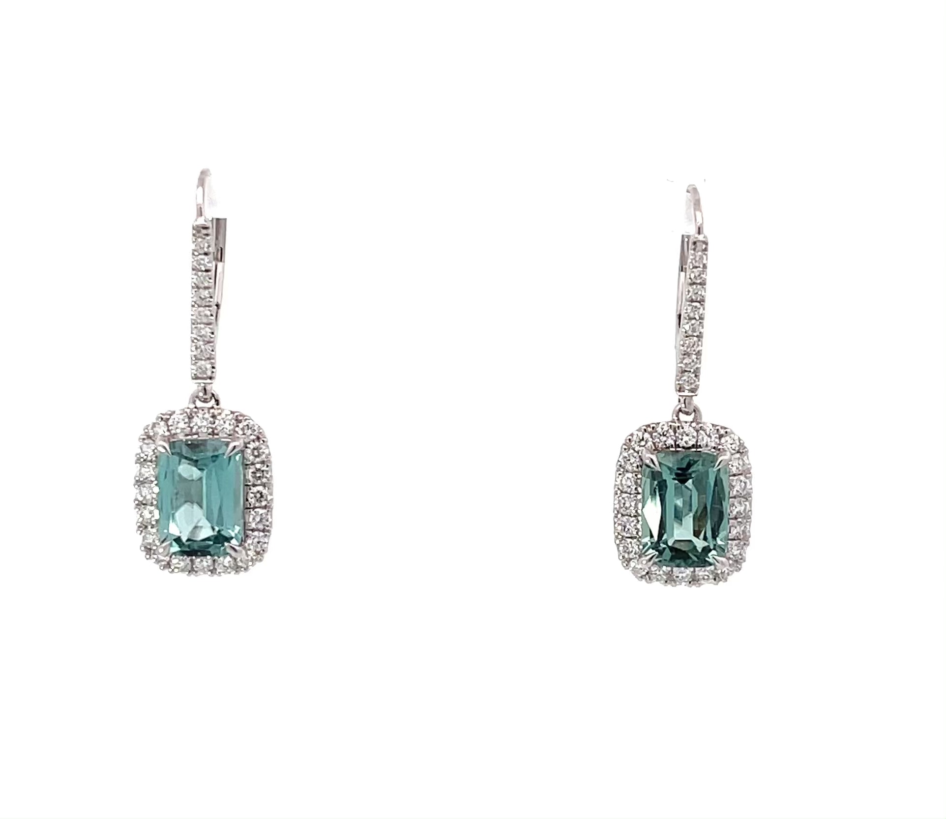 These rare elongated cushion cut seafoam natural blue tourmalines weigh 3.68 carats total weight and are surrounded with .70 carats of Natural Mined diamonds in F/G Color and VS2 Clarity.