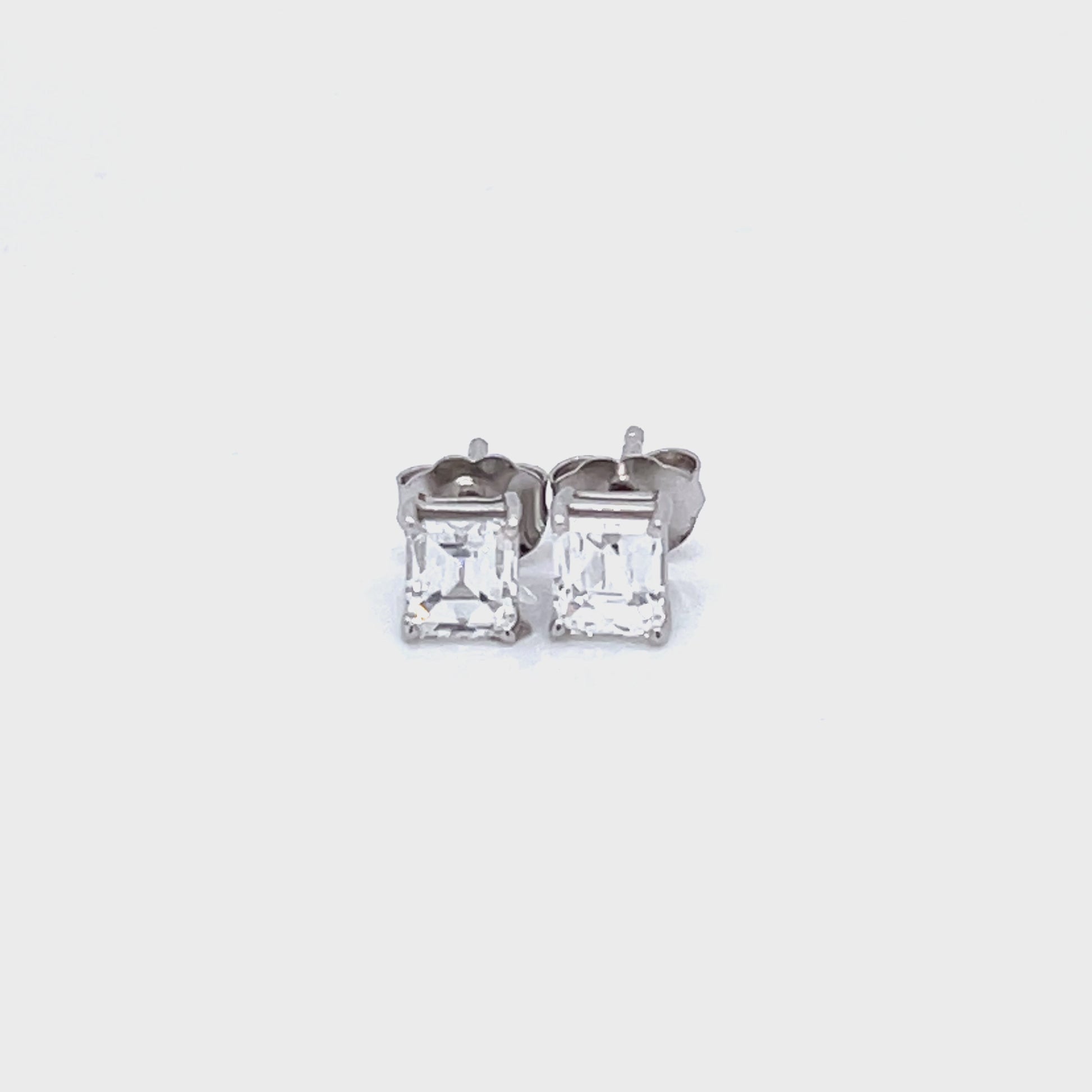 14 karat white gold special modified cushion cut diamond studs with cut corners. These stones weigh 1.23 carats total weight and are graded F in color and VS2 in clarity. The measurements are 4.90 x 4.41 mm with friction posts and large backs.