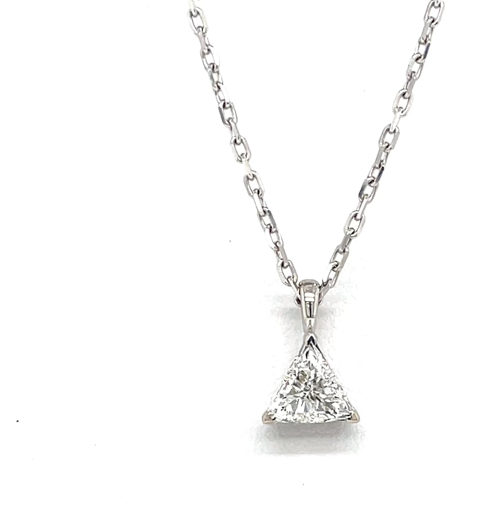 Diamond solitaire pendant weighing .43 carats and set in our 18 karat white gold custom created setting. This Trilliant cut stone is E/F in color and VS2 in clarity (6.61 x 6.28mm). It’s floats on an 16 inch 18 karat white gold cable chain.