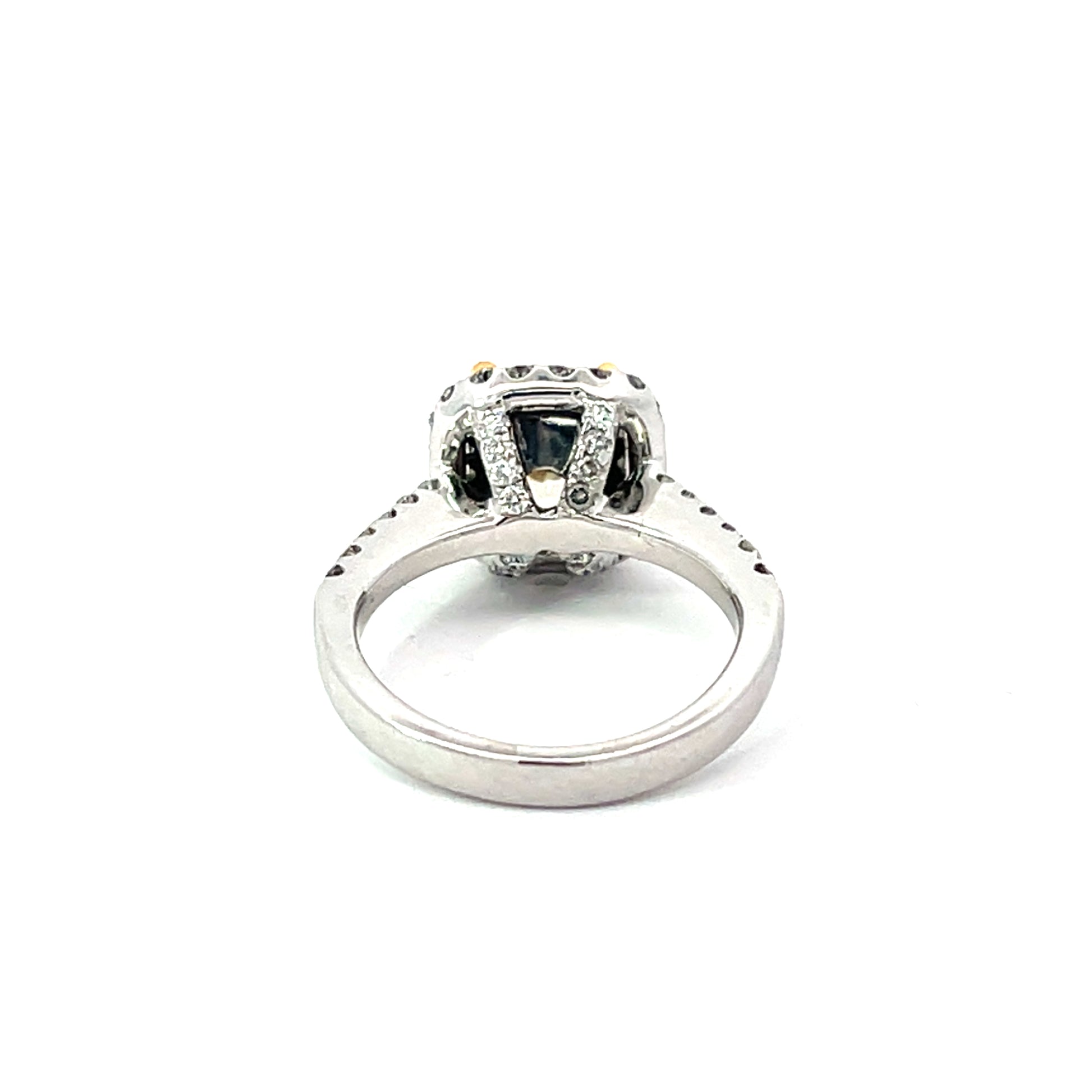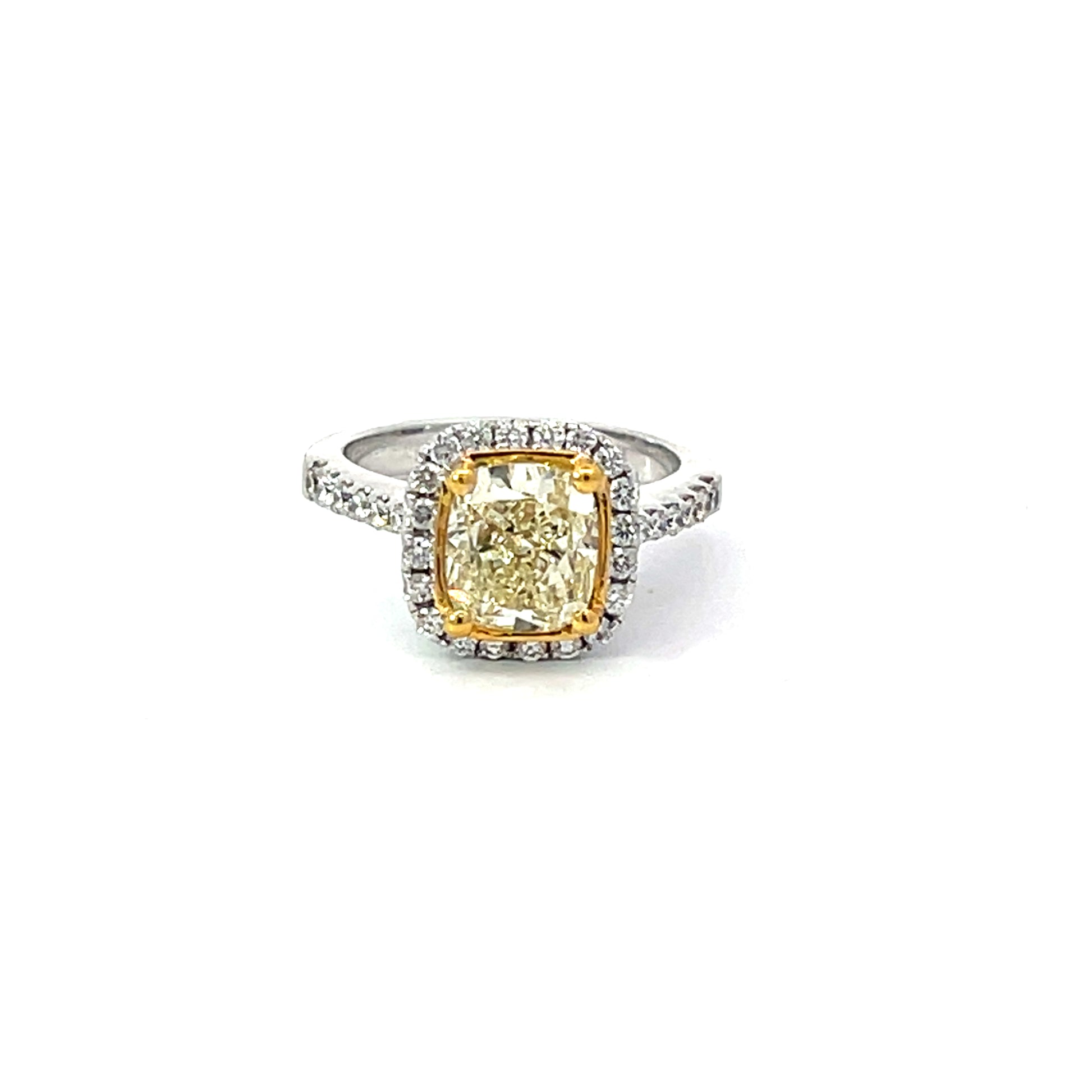 Exquisite engagement ring featuring a fancy yellow cushion cut diamond, radiating warmth and sophistication. This exceptional piece is set in lustrous white gold, enhancing the diamond's unique charm. A timeless symbol of love and commitment, this ring captures the essence of elegance.